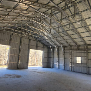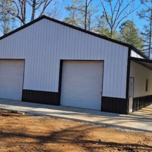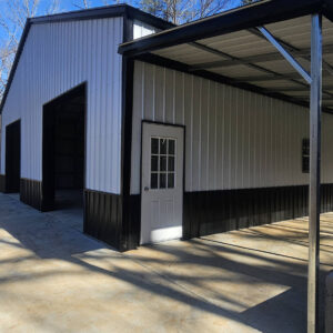 This three bay commercial grade garage is 40′ wide by 40′ long with a 12′ wall. The building comes equipped with a vertical 4:12 roof, vertical side panels with wainscot, three 10’x10′ roll up doors, one walk in door, and a 10′ wide by 40′ long lean-to on a 9′ leg. Constructed 4′ On Center with Ladder Framing, the structure provides 1600 sq ft of enclosed space.